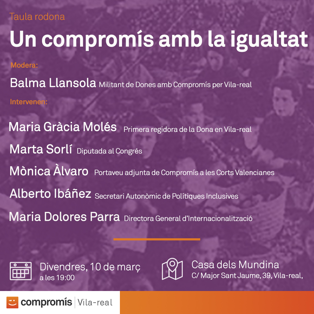 Compromís per Vila-real ha organitzat per a aquest divendres, 10 de març, una taula redona que, sota el títol Un compromís amb la igualtat, pretén donar veu als ciutadans perquè expressen i debaten sobre el tema amb destacats representants de la coalició a nivell local i nacional en diferents àmbits.