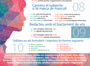 Les 10 recomanacions del cartell proposen l’ús d’un llenguatge senzill, clar, entenedor i igualitari en valencià i ofereixen diverses possibilitats per a evitar el masculí genèric i defugir solucions que puguen resultar pesades o repetitives. Per exemple, en lloc de dir “notificar a l’interessat”, la campanya recomana usar la forma “notificar a la persona interessada”, mentre que per evitar fórmules com “l’alcalde/l’alcaldessa”, suggereix una solució més senzilla i respectuosa com és l’ús de paraules genèriques o col•lectives, com ara “l’Alcaldia”. En els casos que designen una persona en concret, la recomanació és usar el gènere adequat: és a dir, en lloc d’emprar el masculí “l’enginyer, Laia Ferrer”, es recomana usar el femení “l’enginyera, Laia Ferrer”, entre d’altres recomanacions.